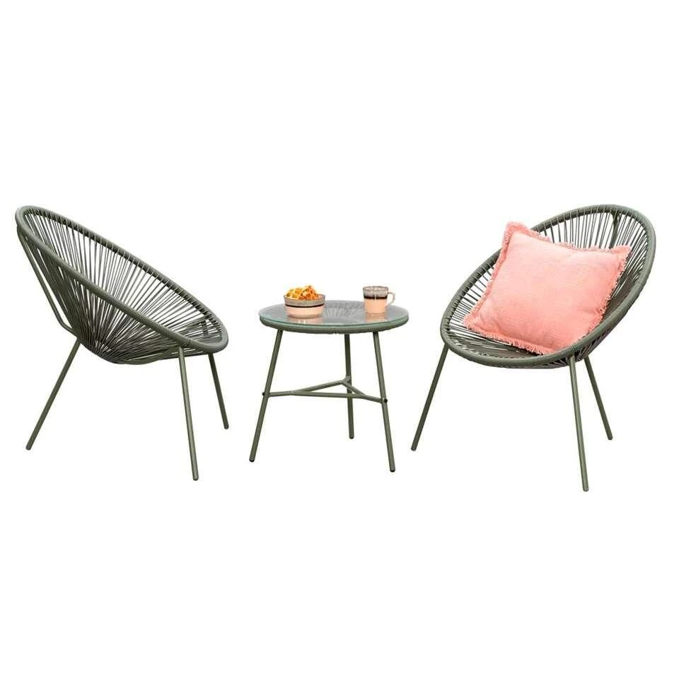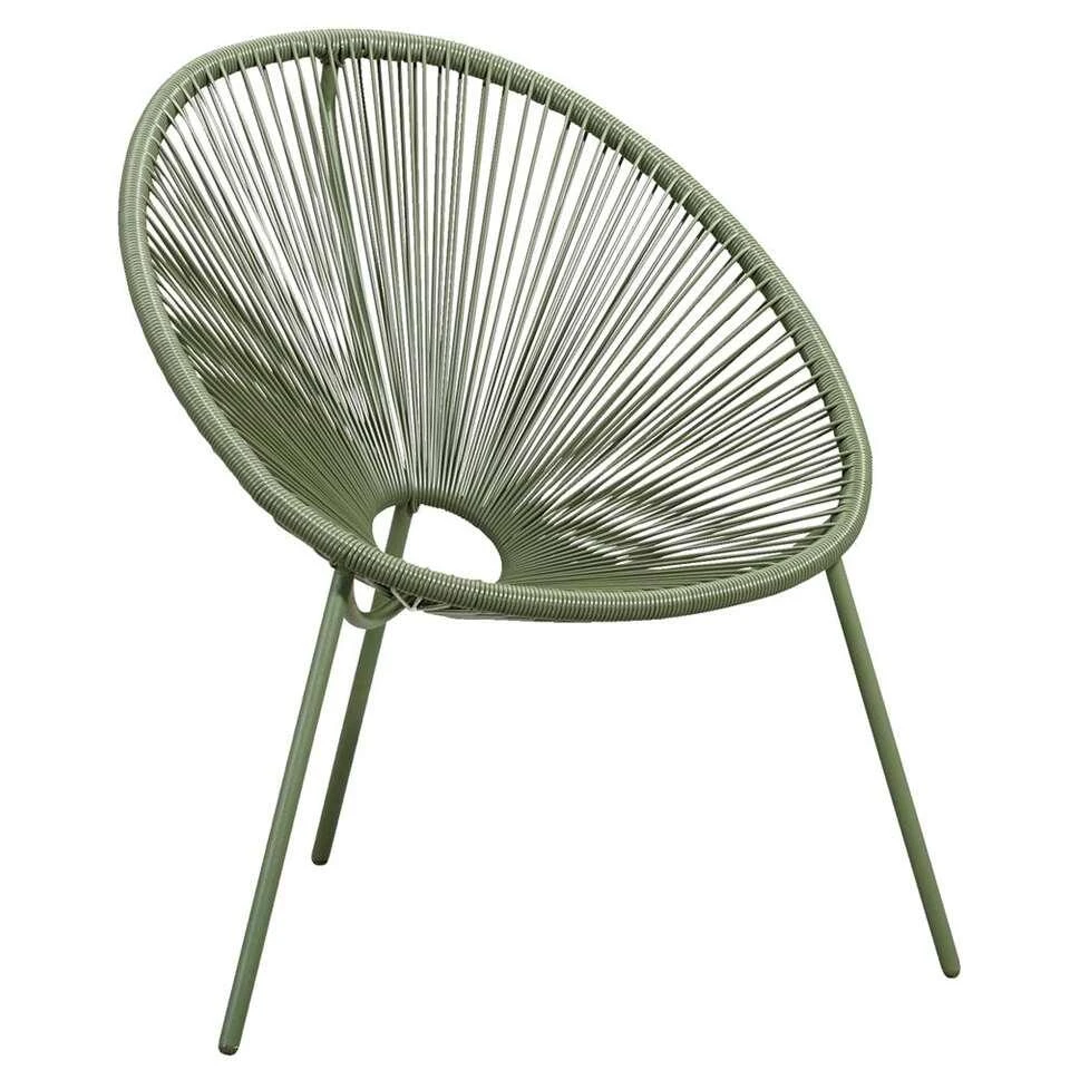 De loungestoelen zijn gemaakt van metaal en afgewerkt met kunststof rope in de kleur olijfgroen.