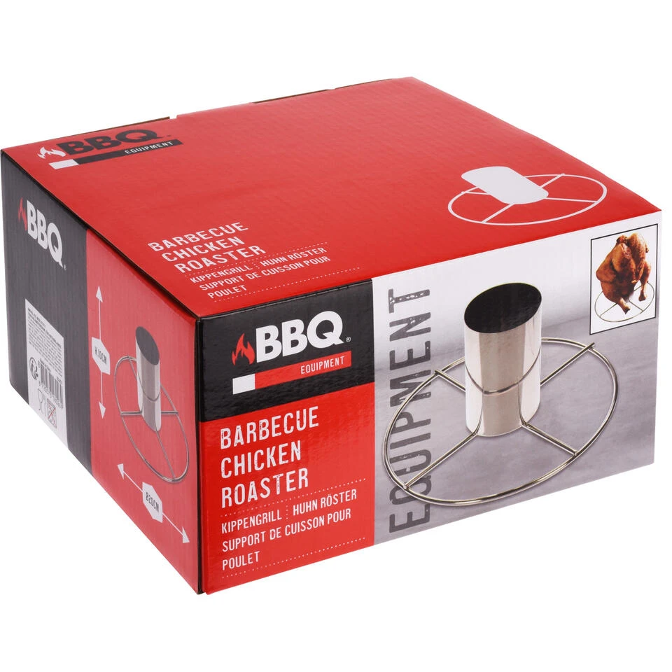 Kiprooster voor de barbecue, 20 cm. Dankzij dit bbq kiprooster in combinatie met een barbecue met deksel, is een kip grillen zeer gemakkelijk. Het bakje kan optioneel gevuld worden met bier of marinade. Materiaal: RVS. Formaat: 20 x 10 cm. Let op: er kan geen bierblikje in!