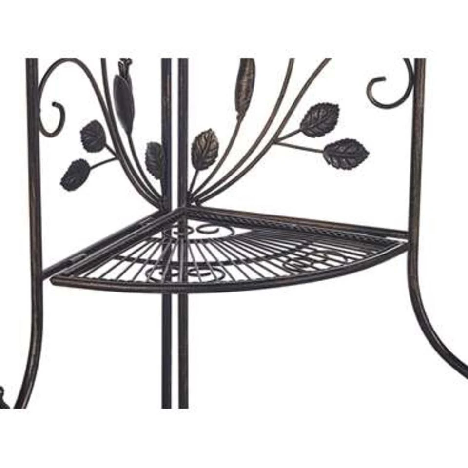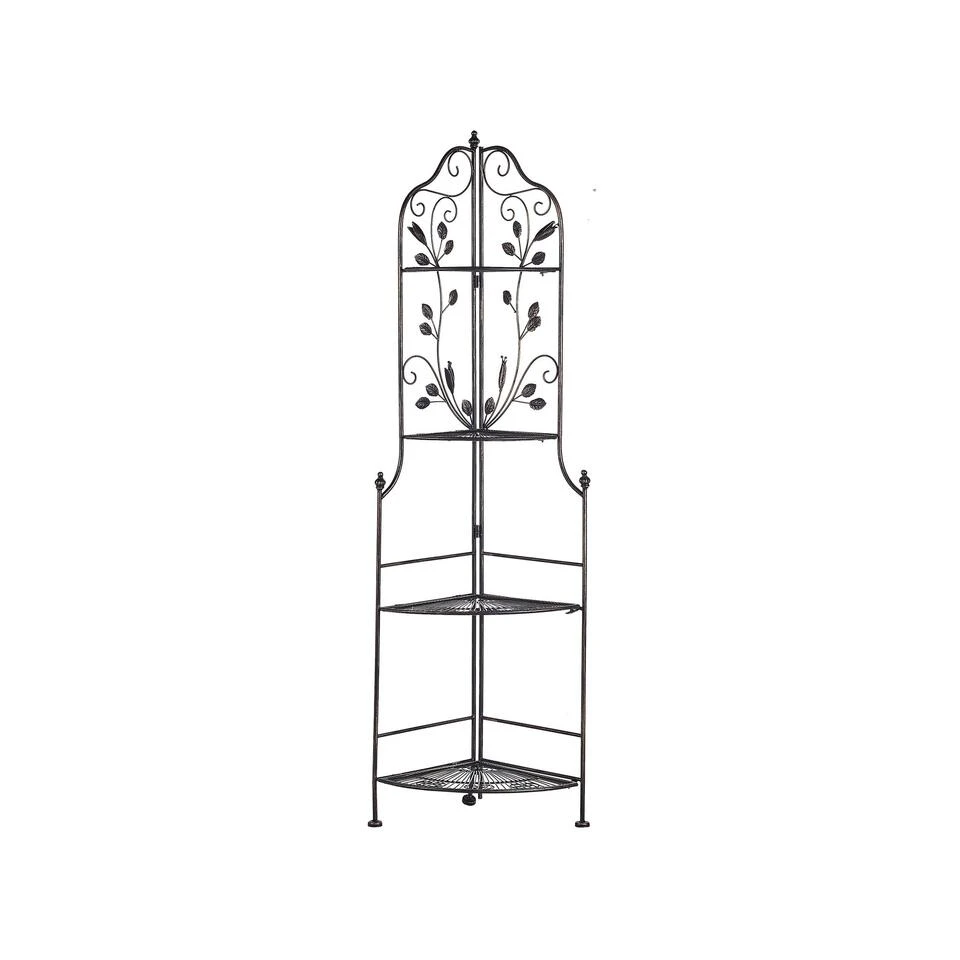 Inklapbare metalen tuinkast met romatische versieringen. Niet alleen ziet dit hoekkastje er prachtig uit, het is ook nog eens heel stevig. Naast het decoratieve element zijn er de 4 planken waarop je zowel planten als andere gebruiksvoorwerpen kunt plaatsen. Dit meubel past perfect in zowel de tuin als in de badkamer, en is inklapbaar om ruimte te besparen.