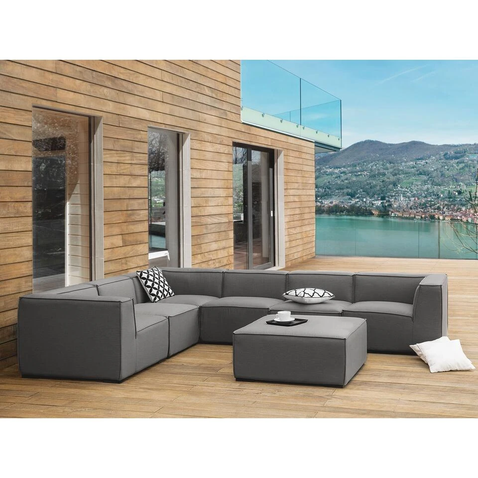 Luxe zevendelig loungeset voor binnen en buiten. Dit veelzijdige set bestaat uit drie hoekbanken, drie middenstukken zonder armleuningen en een vierkante bijzettafel. De onderdelen zijn allemaal in elkaar te schuiven en met elkaar te verbinden middels een modulair verbindingssysteem, waardoor een grote, ruime hoekopstelling ontstaat. Je kan echter ook alle zitelementen als los plaatsen en zo de indeling flexibel naar wens aanpassen aan jouw ruimtelijke omstandigheden. De grote bijzettafel dient als praktische opbergruimte, als comfortabele voetenbank of zelfs als extra zitplaats. De stevige, zwarte voet is gemaakt van gepoedercoat aluminium. Dit loungemeubilair voor binnen en buiten is perfect om het hele jaar door buiten te gebruiken. Het tuinmeubilair is aan de binnenkant opgevuld met een sneldrogend schuim, dat dankzij zijn speciale structuur water veel sneller doorlaat dan zeer elastische schuimen.