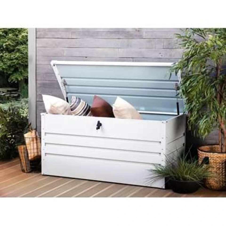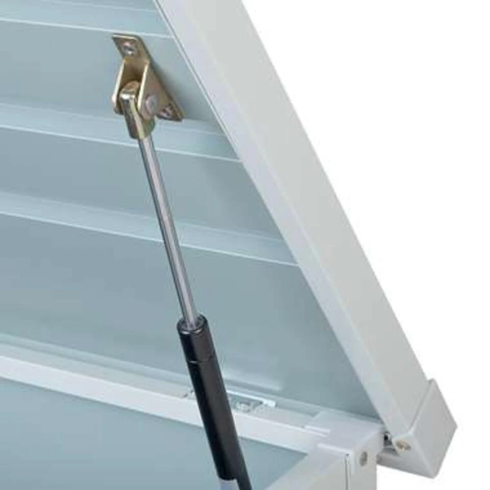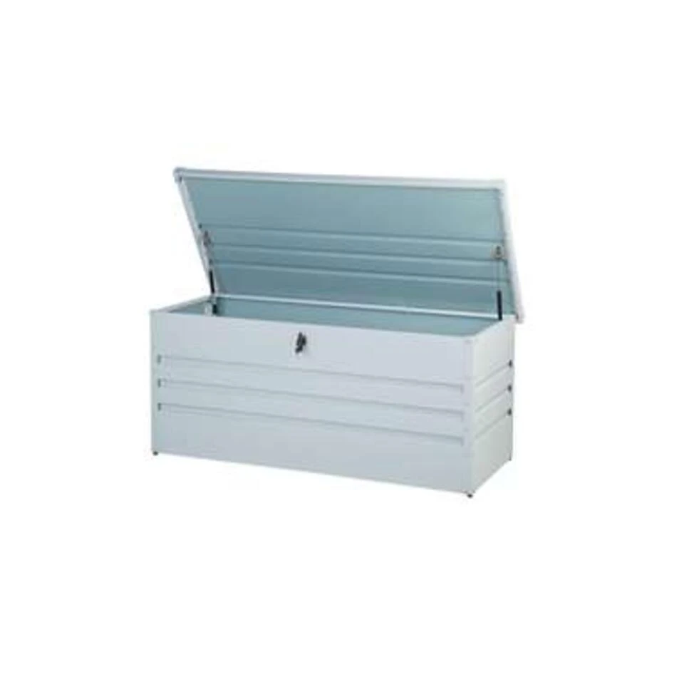 Weerbestendige, grote opbergbox van metaal. In deze robuuste stalen kist vind je voldoende ruimte voor al je tuin-, sport- of kampeergerei. De stevige, gladde deksel kan worden gesloten met behulp van het cilinderslot van de draaigreep en kan gemakkelijk worden geopend dankzij een gasveer.