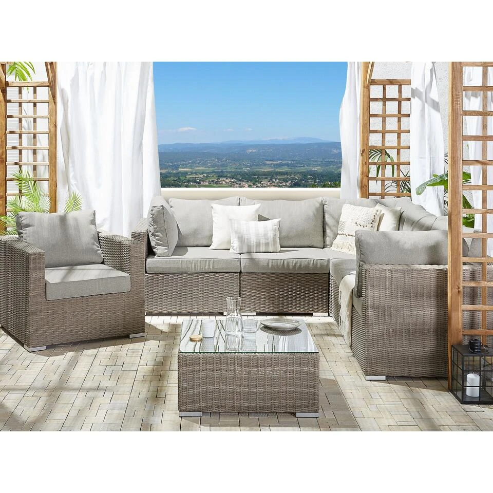 Gezellige, moderne tuinset van polyrotan. Deze prachtige sofaset met klassiek design biedt comfortabele zitplaatsen voor maximaal 6 personen. De set is gemaakt van weerbestendig en UV-bestendig harsrotan en is milieuvriendelijk en robuust. Dankzij de modulaire functie kan de 5-zitshoek wanneer het u uitkomt in 5 afzonderlijke delen worden opgedeeld. De set bevat pluche en zacht aanvoelende kussens voor alle stoelen en rugleuningen. De afneembare hoezen zijn gemaakt van polyester, onderhoudsvriendelijke stof die vochtbestendig en vlekbestendig is. Perfect voor het serveren van drankjes of snacks, de tafel is bedekt met een blad van gehard glas.