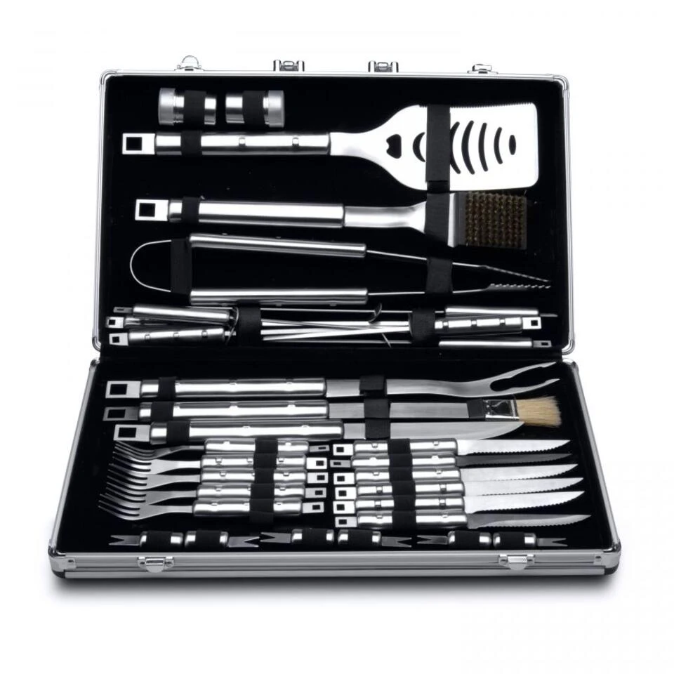 Verwen je gezelschap met de perfecte barbecue. Met deze koffer heb je al het nodige gereedschap voor de voor iedere gerecht. Het materiaal is vervaardigd uit hard roestvrij staal, ideaal voor veelvuldig gebruik. In de mooie aluminium koffer berg je alles veilig en overzichtelijk op. Klaar voor een volgend gebruik.