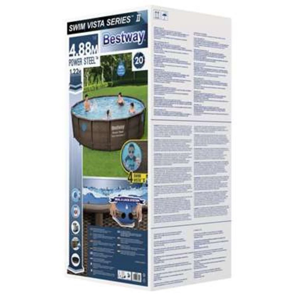 Je beleeft veel plezier met familie en vrienden in deze Bestway Power Steel zwembadset, waarvan de ronde vorm meer ruimte biedt om te zwemmen en te spelen. Dit bovengrondse zwembad combineert duurzaamheid en stijl en de rattanachtige opdruk geeft je tuin een vleugje luxe. Het stijlvolle zwembad heeft versterkte wanden die zijn gemaakt met Tritech, een versterkt 3-laags materiaal bestaande uit gelamineerd, robuust PVC en polyester mesh. Dankzij het hoogwaardige stalen frame en de versterkte zijwanden is het bovengrondse zwembad zeer stabiel en duurzaam. Het zwembad is uitgerust met een Seal & Lock System waardoor een veilige en stevige buisverbinding wordt gegarandeerd. De twee ingebouwde, transparante ramen bieden een interactief wateravontuur. Dit zwembad kan snel en gemakkelijk worden opgezet. Leg het zwembad neer op een plat oppervlak, installeer het hele frame en vul het zwembad met water. Middels het afvoerventiel kan het water gemakkelijk en snel worden afgevoerd. De elektrische filterpomp is een onderdeel van het circulatiesysteem om het water schoon te houden. Het anti-microbiële filterpatroon helpt voorkomen dat algen, schimmels en andere microbiële bacteriën in je zwembad groeien. De ChemConnect dispenser onderhoudt en zorgt voor schoon en gezond zwembadwater. De zwembadladder helpt je om veilig in en uit het zwembad te stappen. De treden aan de ene kant van de ladder kunnen naar de bovenkant worden verplaatst, wat helpt voorkomen dat kleine kinderen op de ladder klimmen om het zwembad te betreden. Dit zwembad is gemakkelijk op te vouwen voor opslag en transport wanneer het niet wordt gebruikt. De inbegrepen zwembadhoes voorkomt algengroei en voorkomt dat je dure vervangingschemicaliën moet kopen.