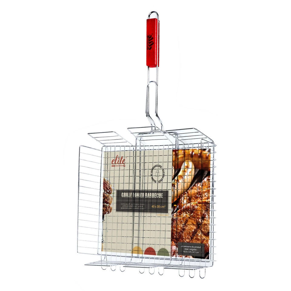Elite BBQ/barbecue rooster grill mandje gemaakt van chrome metaal/hout met afmetingen 42 x 66 x 7 cm. Handig bbq gereedschap om vlees, groente of vis te grillen en gemakkelijk om te draaien zonder uw handen te verbranden. Braadrooster met klempositie verhoger beugel. Geniet van uw bbq maaltijd.