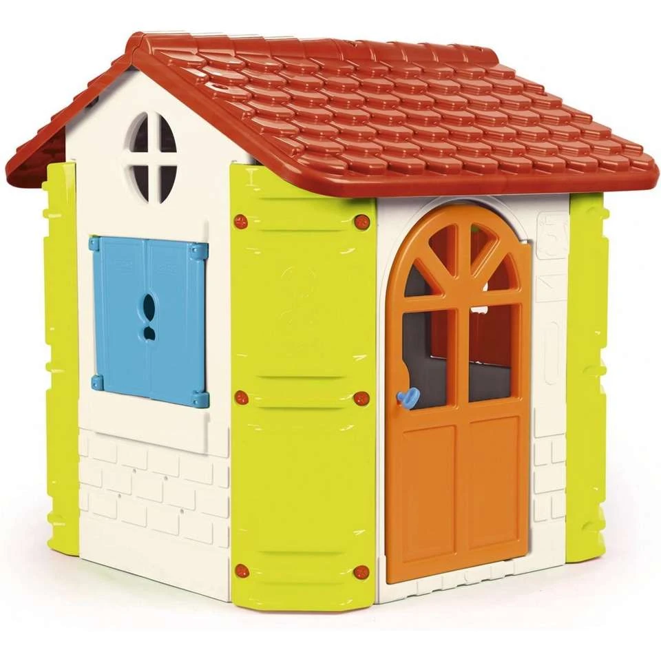 Feber House speelhuis. Dit Feber Speelhuis heeft een deur met sleutel en een raam om open en dicht te doen. Met telefoon en uitklapbare spiegel die je ook als tafel kunt gebruiken. Eenvoudig te monteren en demonteren. In heldere kleuren en bestand tegen zonlicht en temperatuurwisselingen. Afmeting 131 x 110 x 121 cm. Leeftijd 2+.