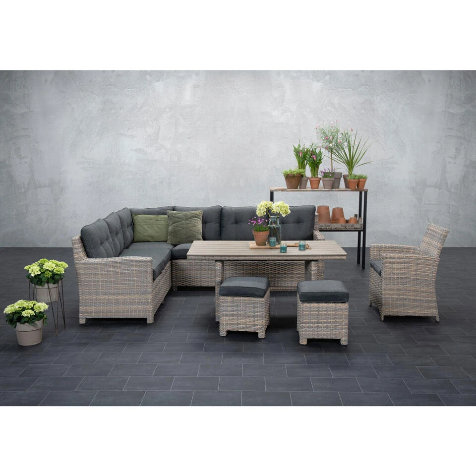 Twijfel je tussen een loungeset of een tuintafel met stoelen? Met de Alaska lounge dining set 6-delig hoef je niet meer te kiezen tussen comfortabel dineren of heerlijk loungen. Deze mooie en ruime lounge dining set van kwaliteitsmerk Garden Impressions heeft het allebei!