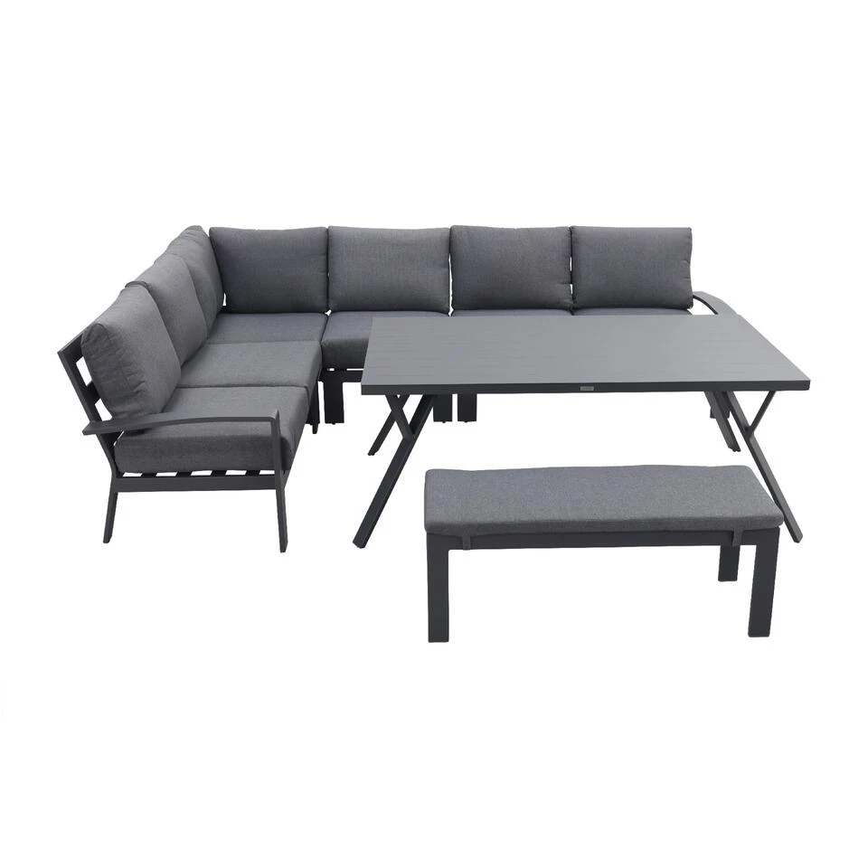 Ben jij op zoek naar een comfortabele lounge- diningset? De Rondo lounge dining is een 6-delig set welke uitgevoerd is met mystic grijze zit- en rugkussens. Deze kleur combineert fantastisch bij het carbon black frame. Het frame is mooi rond afgewerkt en geeft de Rondo lounge diningset dan ook een chique uitstraling. Met zijn ruime opstelling zorgt de Garden Impressions Rondo ervoor dat je met een grote groep kunt dineren, namelijk tot wel 9 personen. De Rondo dinner loungeset bestaat uit een linkse open bank, rechtse open bank, midden element, hoek element, ruime tafel en een bijzetbankje. Dankzij het midden element heb je ook de mogelijkheid om van de lounge- diningset een linkse opstelling te maken. Net wat jou beter uitkomt op je terras.