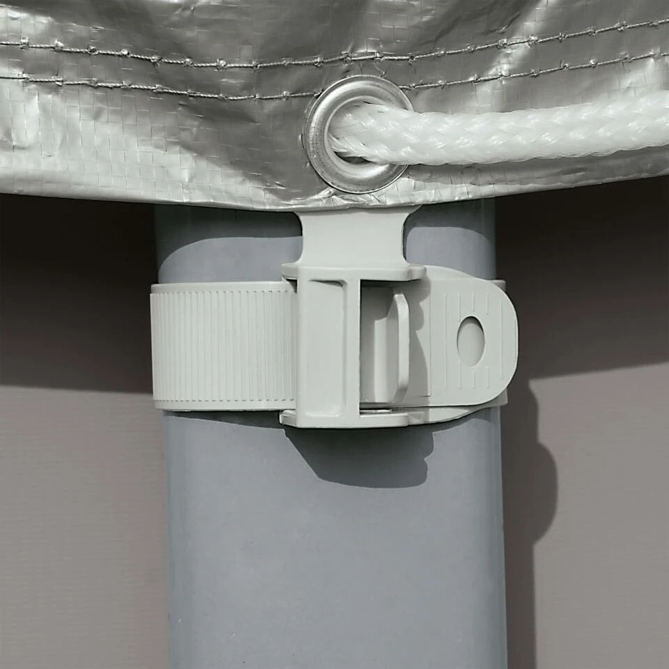 De hoes is gemaakt van hoogwaardig polyethyleen waardoor hij scheur- en UV-bestendig en waterafstotend is. Dankzij de kleine afwateringsgaatjes laat deze zwembadhoes regenwater door, waardoor er geen water op de hoes blijft liggen. De kleine afwateringsgaatjes zorgen ook voor ventilatie. De zwembadafdekking kan stevig aan het zwembad bevestigd worden met de meegeleverde touwbinders.