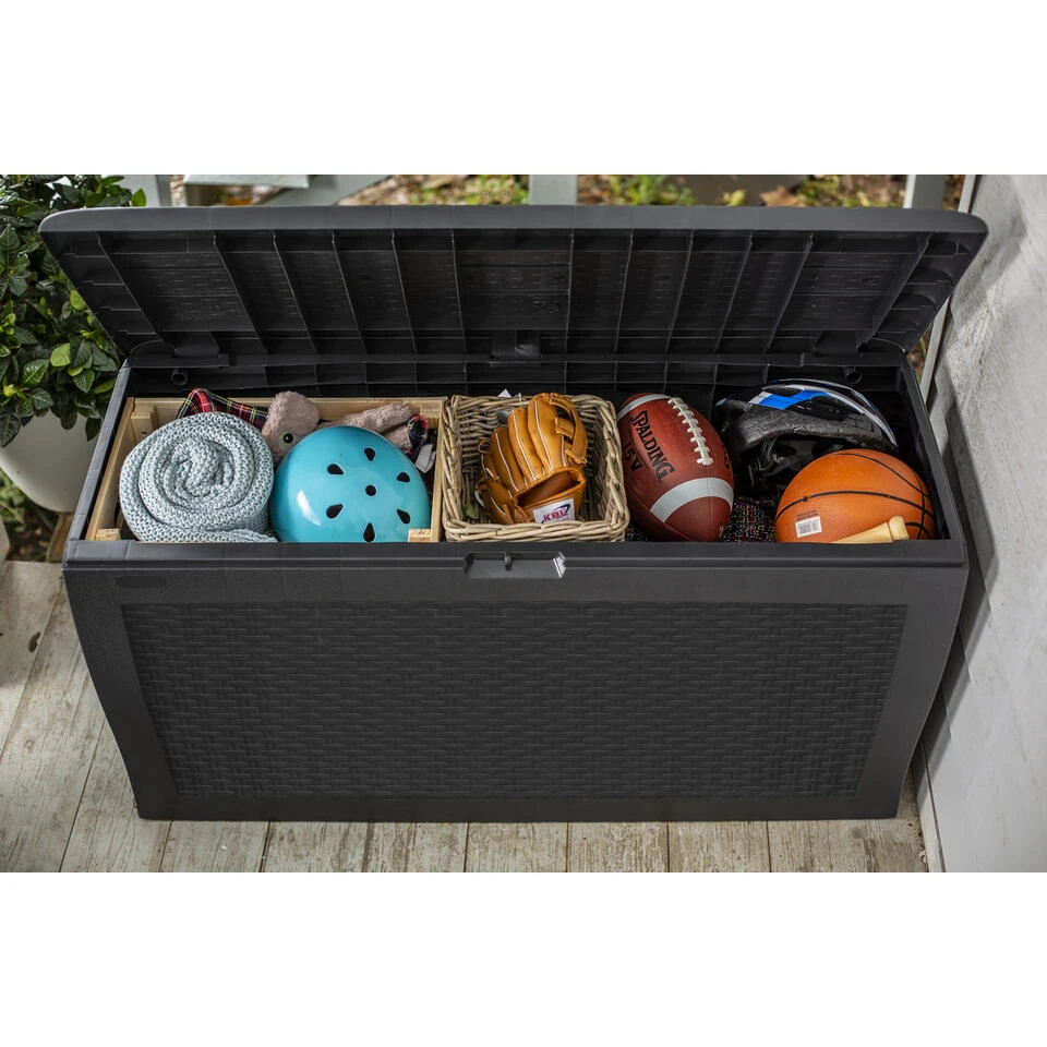 De Keter Samoa Opberbox 270L maakt het opslaan van spullen eenvoudig en aantrekkelijk met een rattan stijl look. De Samoa opbergbox biedt een aanzienlijke opslagruimte van 270L maar is handig genoeg om te passen op uw dek en terras en heeft een aantrekkelijk ontwerp dat zal passen bij elke ruimte. Deze opbergbox is gemaakt van een duurzame, weerbestendige hars die alles droog en geventileerd houdt, van zwembadaccessoires tot lounge stoelkussens. Deze opbergbox wordt geleverd met ingebouwde handgrepen en wieltjes voor eenvoudige verplaatsing. Deze is ook gemakkelijk te monteren.