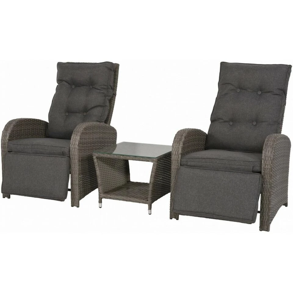 De Melia duoset bestaat uit twee comfortabele loungestoelen en een bijpassende vierkante koffietafel. Deze set is gemaakt van wicker met een natuurlijke uitstraling, waarbij het tafeltje is afgewerkt met een glazen tafelblad. De beide stoelen hebben een verstelbare rugleuning en een verstelbare voetensteun, waardoor er in een handomdraai van een zitstand naar een ligstand kan worden gegaan. De donkergrijze kussens zijn lekker zacht en maken beide stoelen helemaal af. Plaats deze set op het terras, onder de veranda of in de serre en geniet van lange zomeravonden.