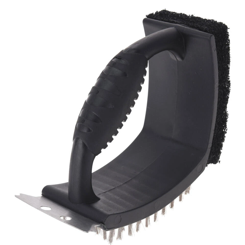 BBQ/barbecue schoonmaak borstel 3-in-1 zwart. Deze barbecue/grill reinigingsborstel is voorzien van een metalenschraper, borstel en nylon schuurspons. Formaat: ca. 12 x 7 cm.