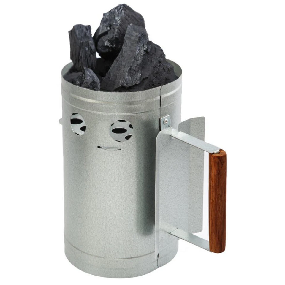 Met deze barbecue starter kunt u houtskool of briketten gebruiksklaar maken. De starter heeft een houten handvat. Het formaat is ongeveer 17,5 x 17,5 x 27,5 cm. Gewicht: ongeveer 720 gram. Materiaal: metaal/hout.