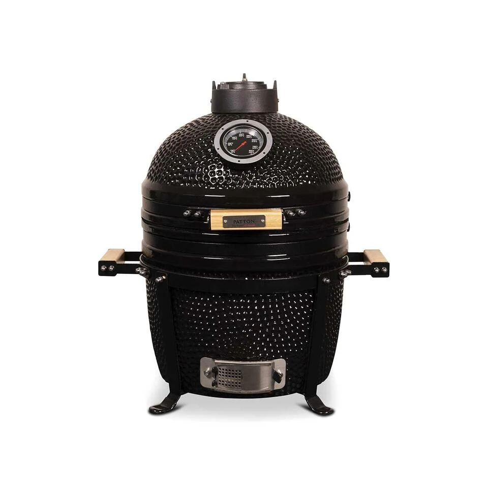 De Patton Kamado Grill 15 inch barbecue zwart is een prachtige barbecue. De naam Kamado is het japanse woord voor kachel of fornuis. Deze prachtige barbecue is veel terug te vinden in de keukens van Michelin sterren restaurants. Door zijn gecontroleerde luchtstroom wordt het vlees nog beter gegaard en blijven sappen in het vlees behouden. Hierdoor blijft jouw stukje vlees nog malser. Deze Patton Kamado 15 inch barbecue is vervaardigd uit een keramische schaal en daarmee bestand tot 1.000 graden Celsius. De vleessappen blijven heerlijk behouden in deze houtskool barbecue. Het is mogelijk om met deze heerlijke barbecue te grillen, roken, maar ook pizza’s kunnen ermee gebakken worden. Dankzij de handige luchtstroom kan er gecontroleerd worden gebarbecued. De barbecue is voorzien van een keramische schaal zodat het vlees sappiger en malser blijft in vergelijking met andere barbecues. Middels de temperatuurmeter in de deksel van de barbecue kan de temperatuur goed in de gaten gehouden worden. De houtskool barbecue kan gemakkelijk worden aangestoken met een briketten starterset. Als de briketten of houtskool warm zijn, kan de barbecue worden gestart. Dankzij het ventilatie rooster kan de luchttoevoer worden geregeld. De houtskool barbecue heeft een afmeting van Ø 53 x H 60 cm. Het grillrooster van deze barbecue heeft een doorsnede van 37 cm.