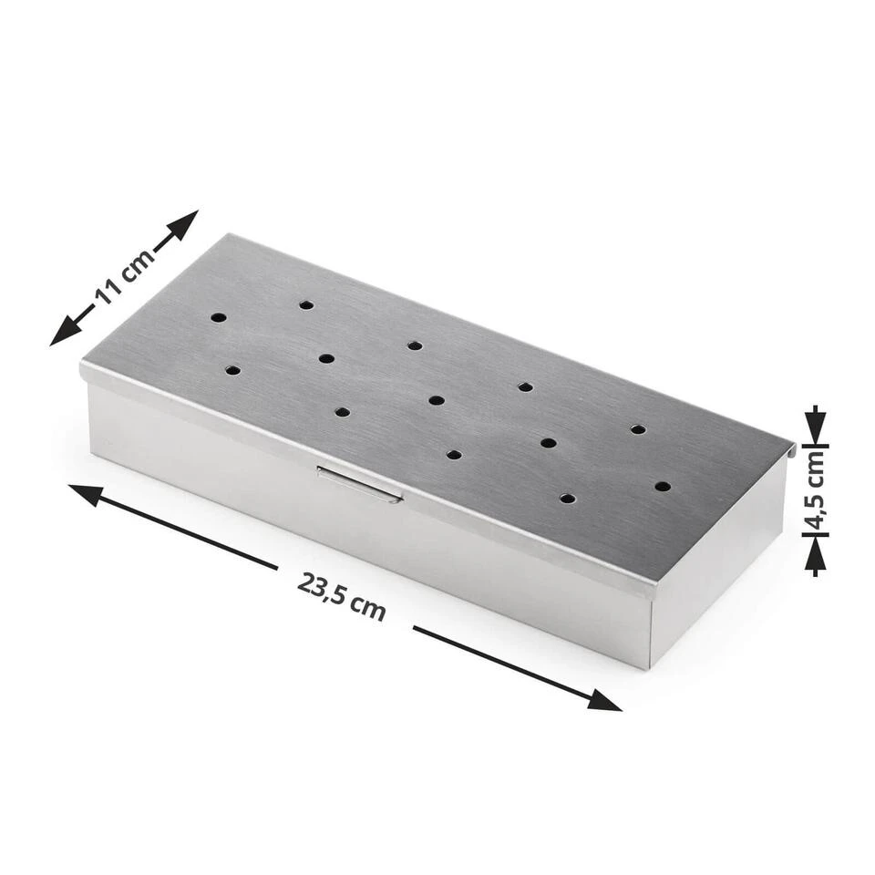 Met de Rosmarino Blacksmith Rookbox maakt u in combinatie met de Rosmarino Blacksmith BBQ heerlijke gerookte gerechten. De rookbox is ideaal voor houtskoolbarbecues waar je hem gewoon op de kolen plaatst en wacht tot het aroma en de smaak zich ontwikkelen en het vlees intens van smaak wordt. Hij is gemaakt van roestvrij staal, bestand tegen hoge temperaturen en vrijwel onverwoestbaar. De deksel heeft gaten in de bovenkant waardoor de rook en het aroma van de frieten ontsnappen. Gemakkelijk te reinigen, zelfs in de vaatwasser.
