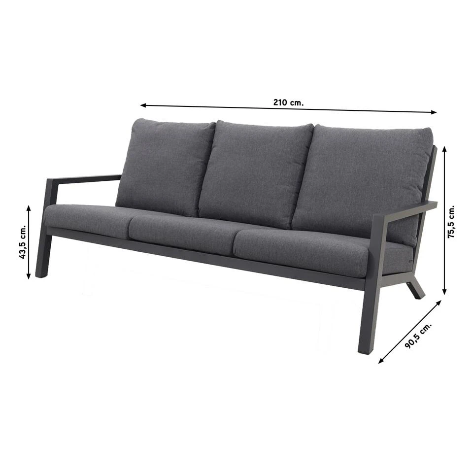 De Atlanta 3-zits loungebank is een ideale tuinbank voor in jouw tuin! Deze tuinbank is onderhoudsvrij doordat hij van aluminium is gemaakt. Hierdoor kan jij heerlijk onbezorgd genieten in jouw tuin. Deze moderne tuinbank heeft een stijlvolle uitstraling door het donkere frame in combinatie met de donkere kussens. Doordat deze tuinbank 2 meter lengte heeft, ben jij verzekerd van een lekkere relaxplek. De meegeleverde kussens zorgen er zeker voor dat jij helemaal tot rust komt in deze loungebank voor buiten. Er zijn verschillende andere producten uit dezelfde Atlanta serie, ook complete loungesets! Bestellen van deze 3-zits bank kan direct online.