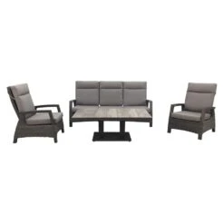 Op zoek naar een comfortabele stoel bank loungeset? Dan is de Darwin loungeset zeker een aanrader! Deze stoel bank loungeset biedt optimaal comfort en past perfect in elke tuin. Het unieke aan deze set is dat de rugleuningen van de loungebank afzonderlijk verstelbaar zijn. Doordat dit traploos gaat kun je altijd jouw gewenste positie aan nemen. De rugleuningen van de loungestoelen zijn ook traploos verstelbaar. De Darwin stoel-bank loungeset bestaat uit 2 verstelbare loungestoelen, 1 verstelbare 3-zitsbank en 1 verstelbare loungetafel (140 x 85 cm.).Â