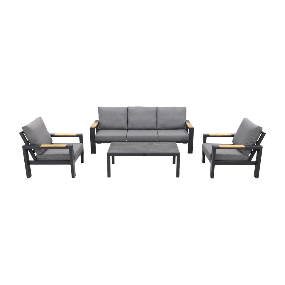 De Hammelton stoel-bank loungeset is niet alleen een lust voor het oog, ook de kwaliteit is zeer degelijk. Het frame van de loungeset is gemaakt van aluminium en kan daardoor niet verroesten. Daarnaast is aluminium licht van gewicht en dus makkelijk te verplaatsen. Voor extra bescherming is het frame afgewerkt met een antracietkleurige coating. De armleuningen van de loungestoelen en de 3-zitsbank zijn afgewerkt met teakhout. Dit heeft als voordeel dat de armleuningen niet heet kunnen worden in de zon. Je kunt dus met een gerust hart je armen op de leuningen laten rusten. De loungeset wordt geleverd met comfortabele kussens van maar liefst 13 cm. dik. Wanneer je de kussens niet gebruikt adviseren wij om deze op een droge en geventileerde plek op te bergen. Om de loungeset compleet te maken wordt deze geleverd met een loungetafel. De loungetafel heeft een lengte van 120 cm. een breedte van 70 cm. en een hoogte van 43 cm. Net als het frame van de loungeset is ook dit frame gemaakt van aluminium. Het tafelblad is gemaakt van keramiek met een houtlook. Keramiek is een harde steensoort en dus perfect geschikt als tafelblad. Daarnaast is het eenvoudig schoon te houden en is het bestand tegen diverse weersomstandigheden.